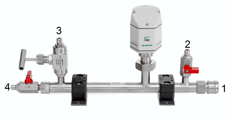 連接壓縮空氣前,請(qǐng)確保球閥2和4完全關(guān)閉。