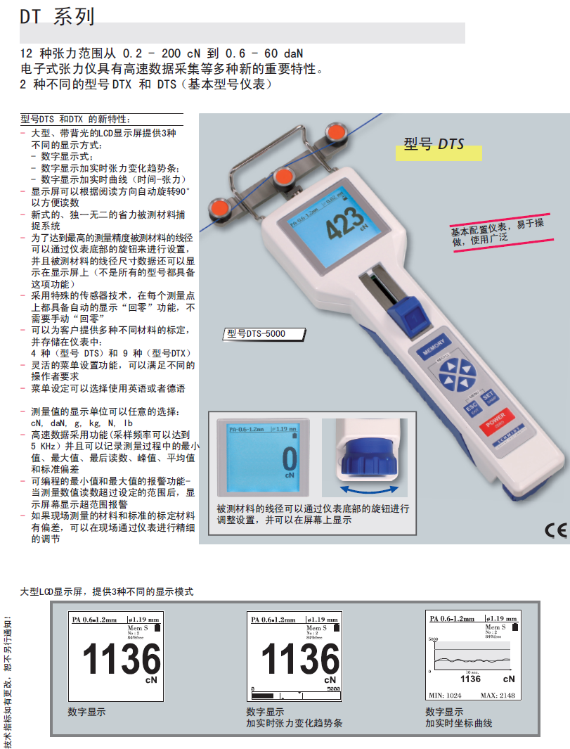1.大型、帶背光的LCD顯示屏提供三種不同顯示方式,數(shù)字顯示,數(shù)字顯示加實時張力變化趨勢條,數(shù)字顯示加實時曲線(時間-張力),顯示屏可以根據(jù)閱讀方向自動選擇90度方便讀數(shù)。新式的、獨一無二的省力被測蔡麗捕捉系統(tǒng)。為了達(dá)到zui高的測量精度被測蔡麗的線徑可以通過一般底部的旋鈕進(jìn)行設(shè)置,并且被測蔡麗額線徑尺寸數(shù)據(jù)還可以顯示在顯示屏上(不是所有型號都可以)。采用特殊的傳感器技術(shù),在每個測量點上都具備自動顯示 回零 功能,不需要手動回零,