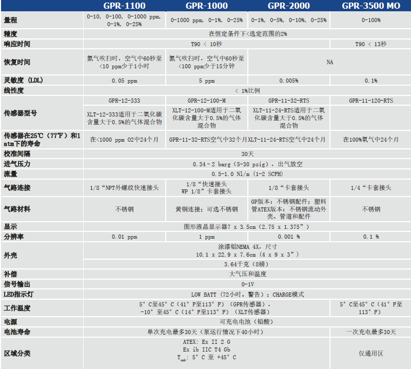 便攜式氧氣分析儀0.1 ppm至100%氧氣 GPR-1000, GPR-1100, GPR-2000 & GPR-3500