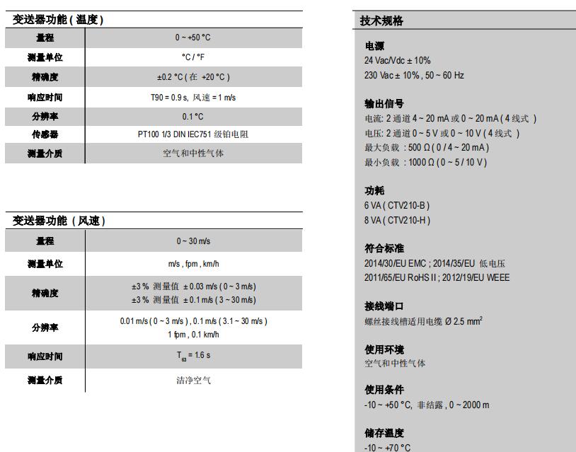 ? 量程 : 0 ~ 1 m/s 到 0 ~ 30 m/s , 0 ~ 50 °C