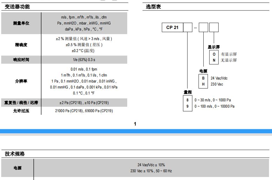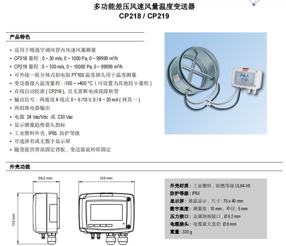 CP218/CP219多功能差壓風(fēng)速風(fēng)量溫度變送器適用于暖通空調(diào)風(fēng)管內(nèi)風(fēng)速風(fēng)量測量,CP218 量程 : 0 ~ 30 m/s, 0 ~ 1000 Pa, 0 ~ 99999 m3/h,可外接一組分體式鉑電阻 PT100 溫度探頭用于溫度測量