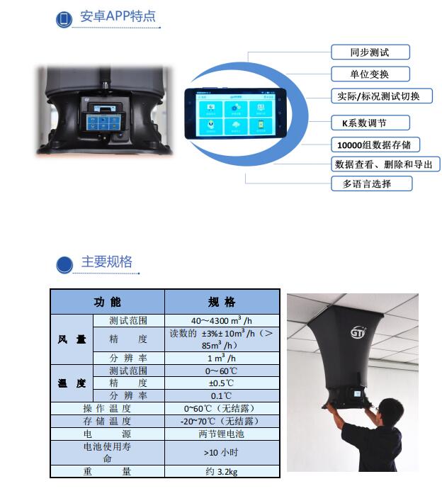 伸縮桿、升降架(帶風(fēng)量罩測試時,整體高度≥3.4m)、儀表掛帶 |