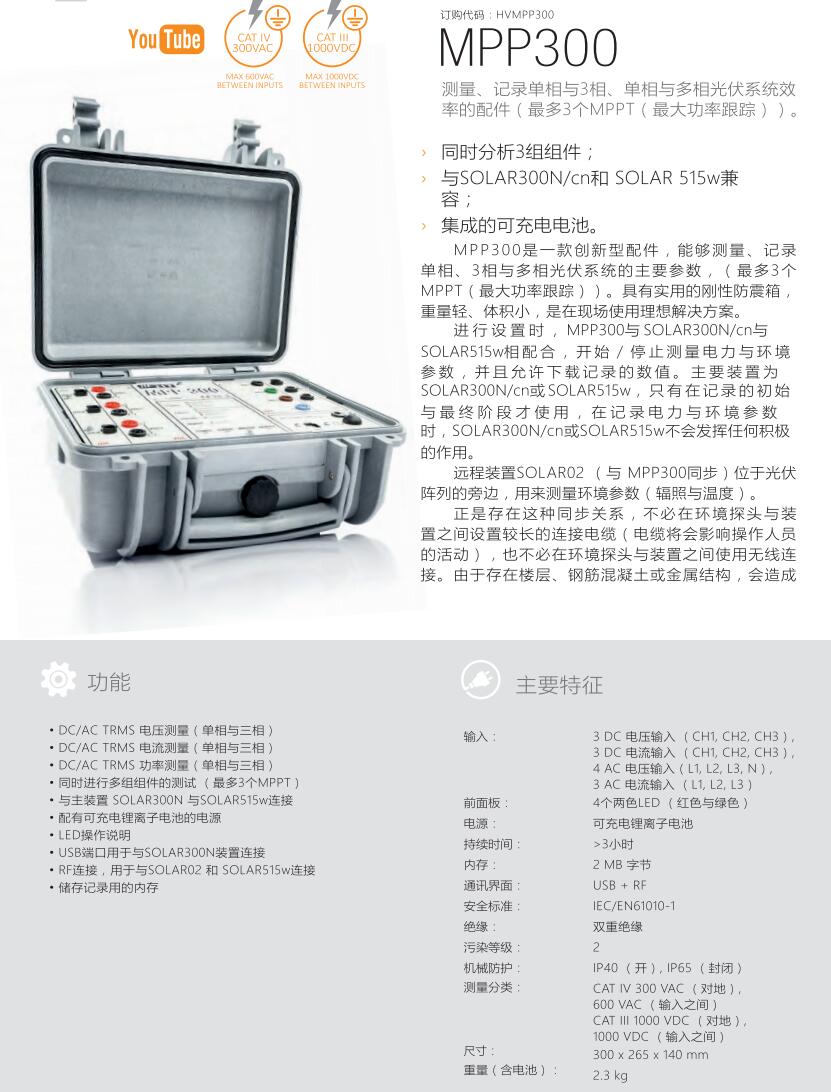 了測量必要的同時性,而且,這兩上獨立的單元可以在任何情況下,舒適安全地進行測量。MPP 300的拍檔SOLAR515w