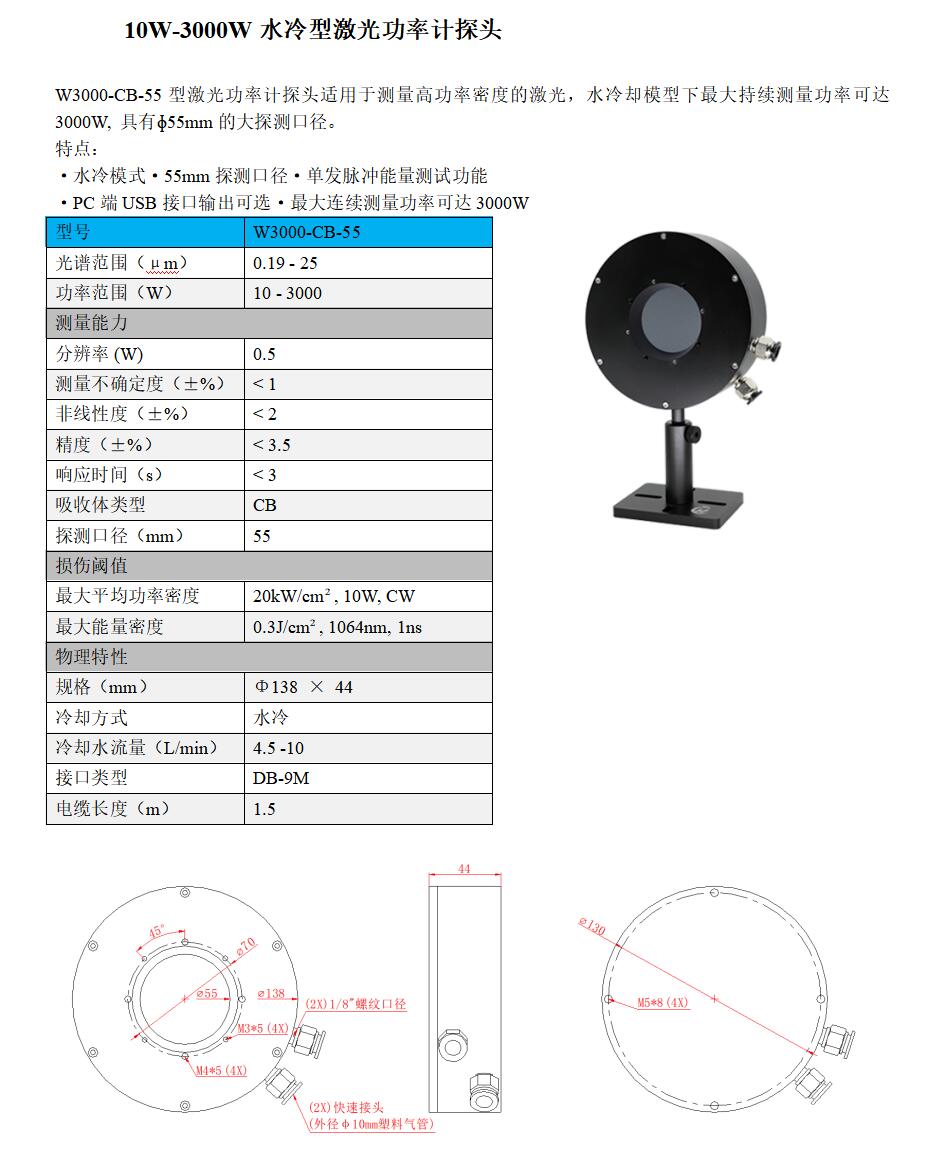 W3000-CB-55型激光功率計探頭適用于測量高功率密度的激光,水冷卻模型下最大持續(xù)測量功率可達3000W, 具有?55mm的大探測口徑。