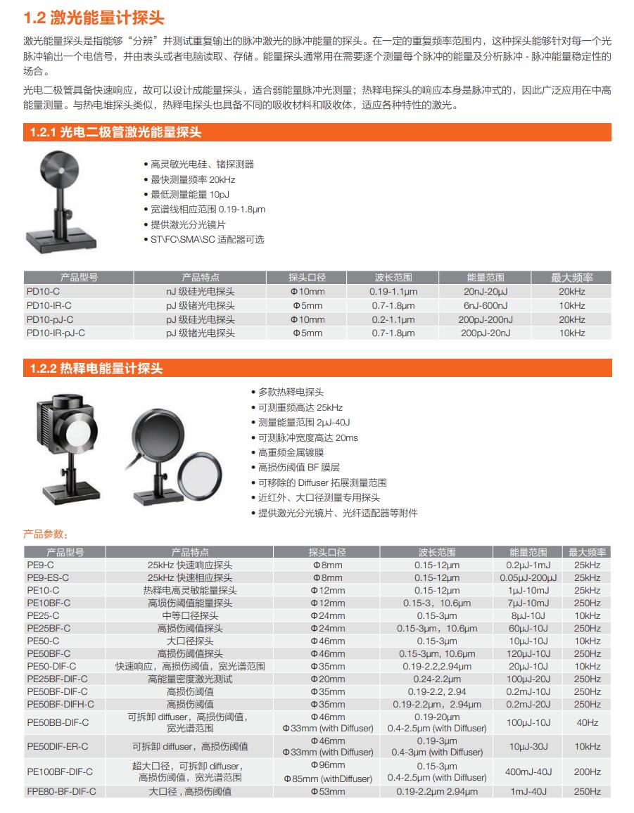 多款熱釋電探頭 ? 可測重頻高達(dá)25kHz ? 測量能量范圍2μJ-40J ? 可測脈沖寬度高達(dá)20ms ? 高重頻金屬鍍膜