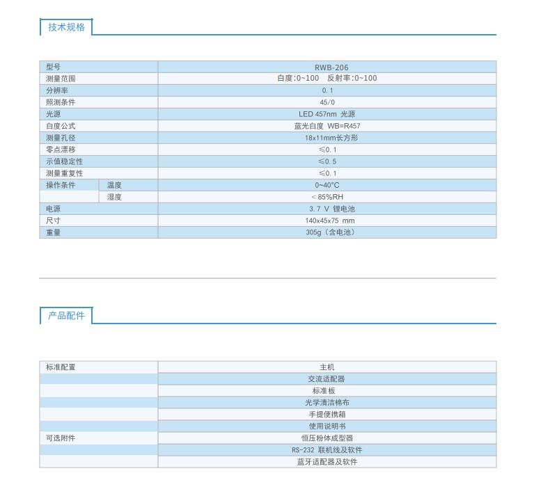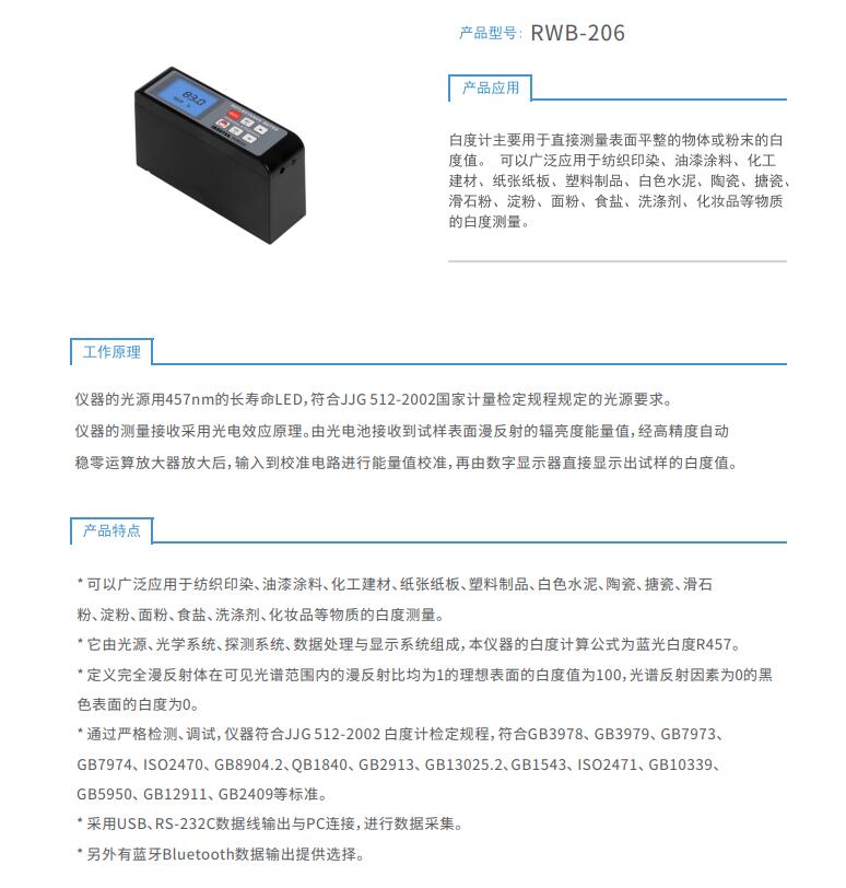 RWB-206主要用于直接測量表面平整的物體或粉末的白 度值。