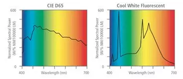 上圖中顯示了 D65 光照(日光)下匹配但在白熾燈下并不匹配的兩種顏色。這意味著如果您在正午日光下看這兩種顏色,它們會顯得匹配。但進(jìn)入室內(nèi)在臺燈下,您會注意到它們實際上是不同的顏色。